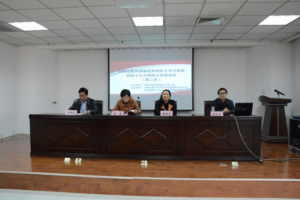 12月27日下午,按照《河南省总工会关于开展河南省职工 学习贯彻党的十九大精神 千名劳模大工匠·万场大宣讲活动的通知》要求,由中原出版传媒集团主办、河南省新华书店发行集团承办的出版集团系统职工第二场学习贯彻党的十九大精神宣讲会在发行集团四楼会议室举行,中原出版传媒集团党委委员、副总裁、集团直属单位党委书记马雪总裁,集团工会副主席、集团直属单位党委副书记张彩华主席出席会议,发行集团班子成员、中层人员、部分党员和职工代表,及来自河南省新华书店文化发展公司、销售与市场杂志社、《中学生学习报》社、出版对外贸易公司共6家单位150余名干部职工参加了此次宣讲学习活动。 此次宣讲活动由发行集团党委书记宋保安主持,马雪副总裁首先介绍了本次大宣讲活动的目的、意义和要求。她指出,集团系统各单位可以结合自身实际,创新方式,深化学习,组织各级劳模工匠、基层一线涌现出来的先进模范、技术能手等,通过职工大讲堂、班组会等多种接地气的活动载体,开展形式多样的基层宣讲,做好党的十九大精神的宣传传播,引导广大职工更好地用十九大精神武装头脑、指导实践,比学赶帮、团结奋进,让十九大精神在集团系统广大职工群众中间落地生根、开花结果,从而更好更快地推动集团产业升级和转型发展。