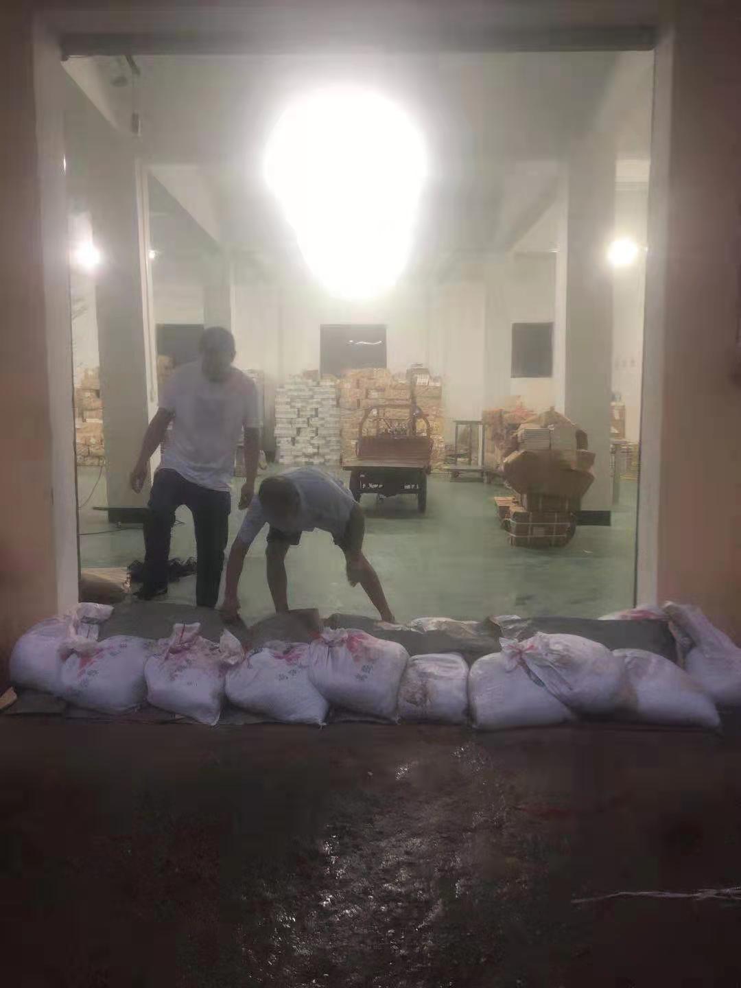扶沟县新华书店职工用沙袋堵住雨水进入仓库