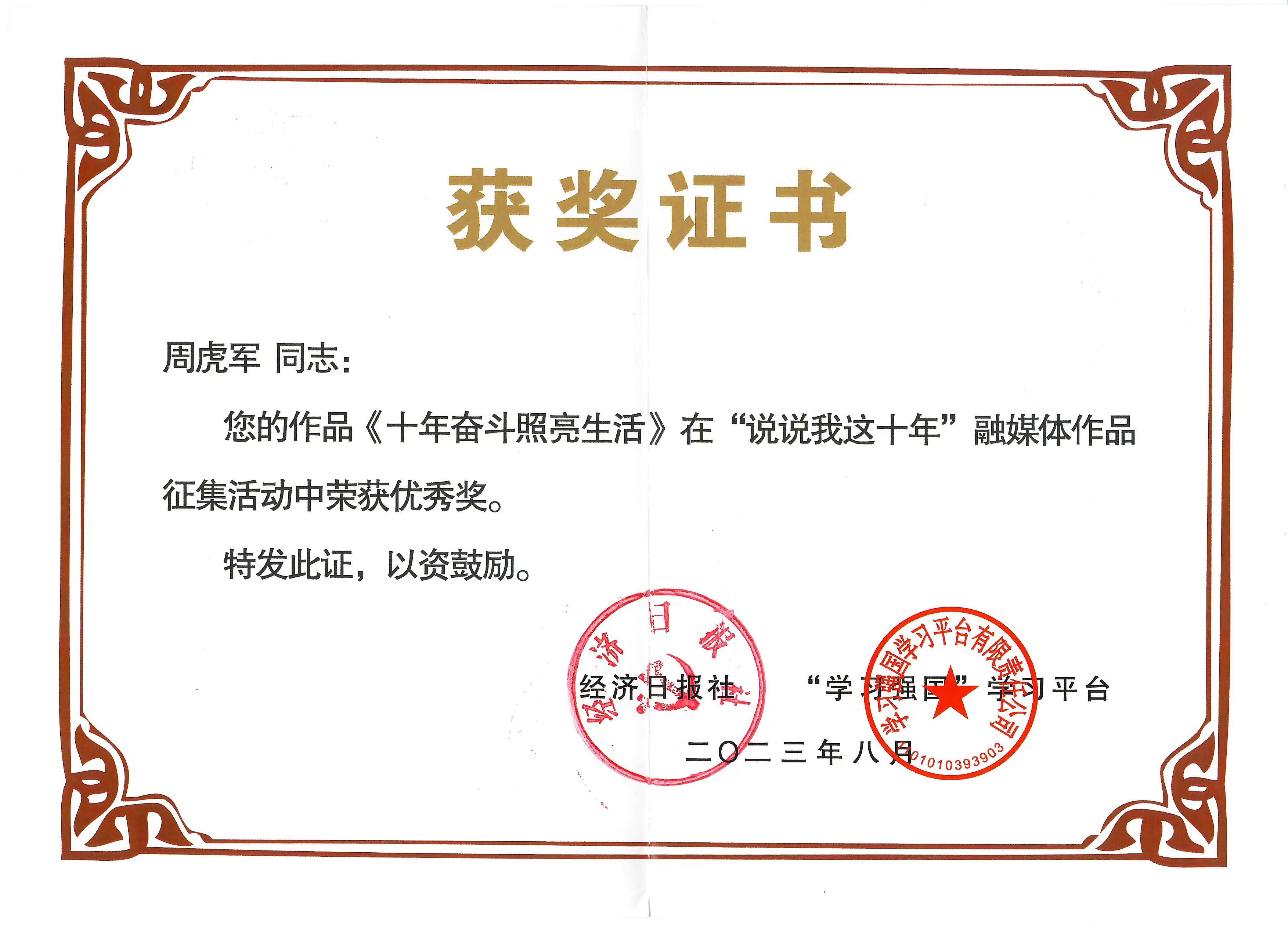 经专业评选委员会严格评审,共有105篇投稿作品获奖,其中“一等奖”2篇,“二等奖”5篇,“三等奖”10篇,“优秀奖”88篇。巩义市店员工周虎军的作品《十年奋斗 照亮生活》荣获“优秀奖”。