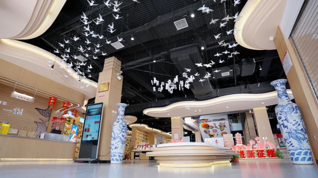 以“殷商文化”为核心的商丘市新华书店凯旋路店,营业面积达3000平方米,店内陈列覆盖社科、文学、艺术、科技、生活、少儿、教育等图书4万余种、10万余册,并设置了文化阅读、多元文创、艺术展示、交流分享、AI自习室等多个专区,是一个集文化学习、社交互动、文艺展览于一体的多功能文化阅读空间。在空间表达上,凯旋路店深挖地域文化元素,特别是“玄鸟生商”的甲骨文飞鸟造型环顶一楼整个大厅,艺术区的“梁园八景”古朴灯箱与文房四宝交相呼应营造典雅文化氛围,李白《梁园吟》的石壁雕刻让很多前来的家长和孩子驻足欣赏、轻轻吟诵,以及“应天文化讲堂”活动专区举办的“朗读者沙龙”“我是经典传诵人”等系列丰富阅读活动,为读者提供高品质的文化体验。此外,凯旋路店积极探索“文化+科技”的创新融合,在三楼和负一楼打造的数智AI自习室和科普研学实践基地即将落地,为读者带来智能化、趣味性的全新体验。