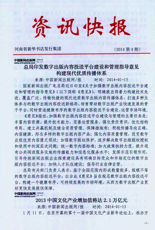 来源:河南省新华书店发行集团有限公司  作者:河南省新华书店发行集团有限公司  发布时间:2014/1/17 9:54:31  阅读次数:9219