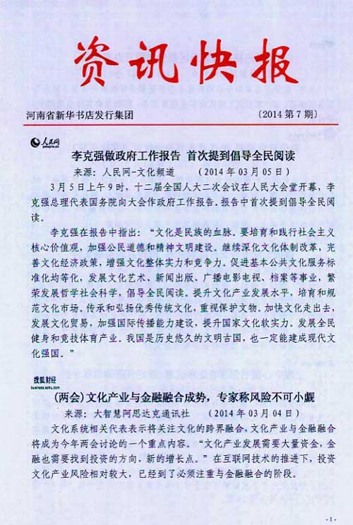 来源:河南省新华书店发行集团有限公司  作者:河南省新华书店发行集团有限公司  发布时间:2014/3/7 10:06:31  阅读次数:11567