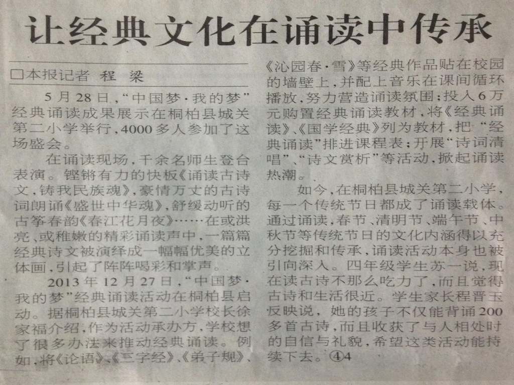 2013年12月27日,桐柏县“中国梦·我的梦”经典诵读活动启动。此次经典诵读活动以桐柏县店店校联办读者俱乐部为平台,以了解中国传统文化、汲取民族智慧为出发点,进一步丰富完善读者俱乐部的服务功能,使之真正成为“未成年人思想道德建设教育基地”。日前,桐柏县“中国梦·我的梦”经典诵读成果展示活动在城关二小举办。在诵读展演中,丰富的表现形式,加上孩子们精彩的诵读,饱满的热情,高昂的激情,充分展现了古诗文朗诵的艺术感染力和舞台表现力,展现了中华经典穿越时空的恒久魅力。